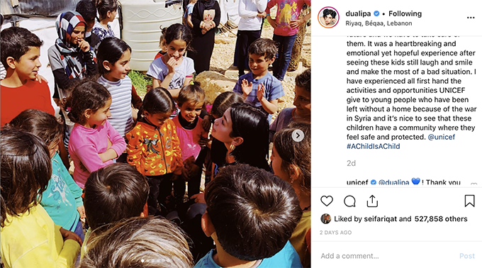 She described the experience as “eye-opening” in a lengthy Instagram post and added, “I particularly want to speak up for refugees as I feel I have a personal connection to seeing people adapt to any circumstance they were put in because of conflict. No family or child chooses to leave their home. They all have dreams. They all deserve equality and a place to be able to live, learn and reach their full potential.”