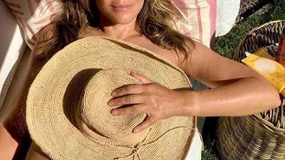 Elizabeth completely forewent her bikini top as she held her hat over her cleavage to protect her modest.