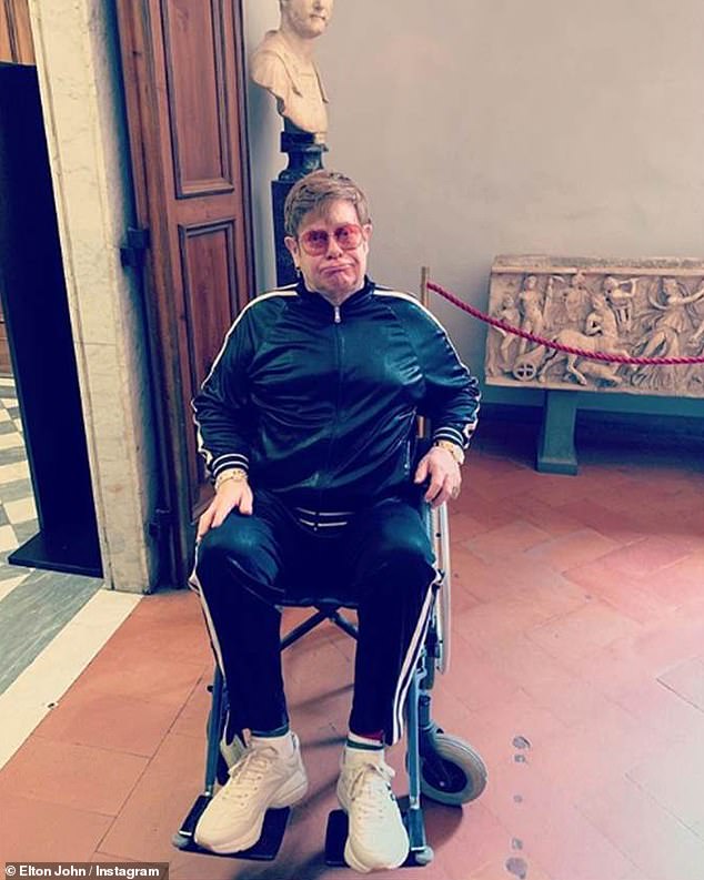 In recovery: Elton John looked glum in an Instagram snap shared on Thursday, as he revealed he is temporarily wheelchair-bound while recovering from a sprained ankle