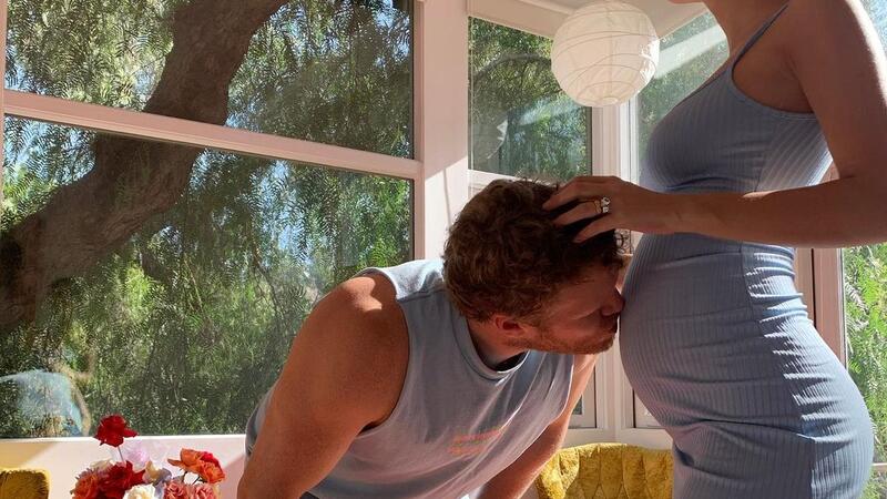 In the sweet photo, the Uncut Gems producer, 31, can be seen leaning down to kiss his wife's baby bump, just days after she entered the 20th week of her pregnancy.