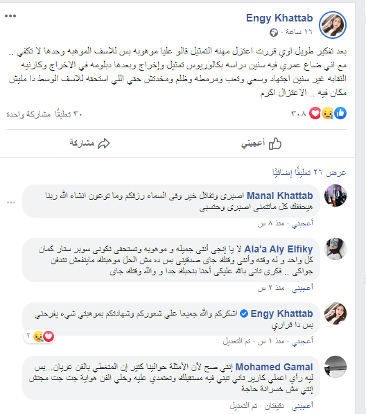 With a short statement she posted on Facebook, Engy wrote: "After a long thinking, I decided to retire from the acting profession. They said that I am talented, but unfortunately talent alone is not enough."