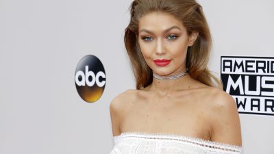 Gigi kept her fresh face radiant without any makeup and wore her golden tresses tied back in a bun.