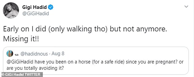 'Have you been on a horse (for a safe ride) since you are pregnant? or are you totally avoiding it?' Twitter user @hadidnous asked, to which Gigi, 25, responded, 'Early on I did (only walking tho) but not anymore. Missing it!!'