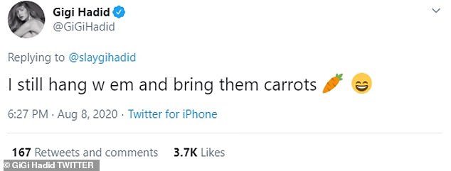 Minutes later, the daughter of Yolanda Hadid added, 'I still hang w em and bring them carrots' along with both carrot and smiling eyes emojis.