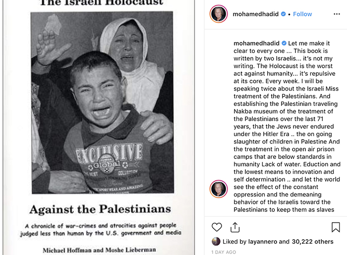 “Every week. I will be speaking twice about the Israeli holocaust against the Palestinians. And establishing the Palestinian traveling holocaust museum of the treatment of the Palestinians over the last 71 years, that the Jews never endured under the Hitler Era. The ongoing slaughter of children in Palestine and the treatment in the open air prison camps that are below standards in humanity and lack of water. Education and the lowest means to innovation and self-determination. And let the world see the effect of the constant oppression and the demeaning behavior of the Israelis toward the Palestinians to keep them as slaves rather than humans,” Hadid boldly wrote on Instagram.