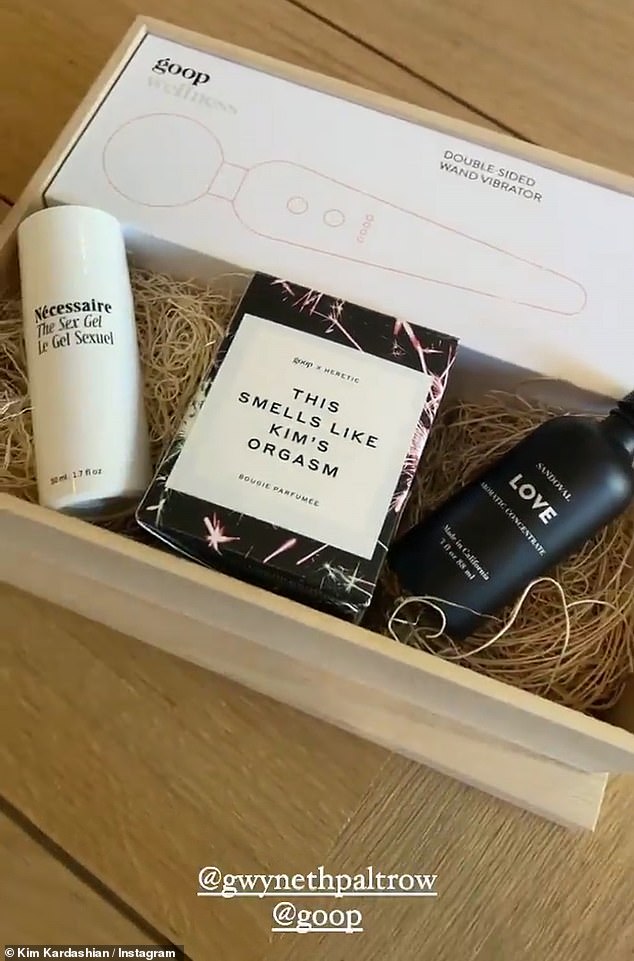 The reality superstar, 40, gave Goop's latest offerings a bit of buzz as she opened an unassuming package labeled 'Kim‘s box of tricks,' which was filled with sexy-time supplies like a vibrator, lube and a cheeky candle called 'Smells like Kim's orgasm.'