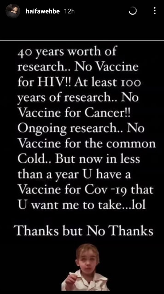 The Lebanese diva wrote a lengthy Instagram story explaining her point of view about the vaccine.