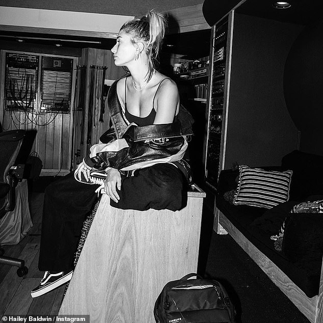 Showing support: Hailey Baldwin shared a couple of black and white snaps of herself in the recording studio with husband Justin Bieber: 'Studio Wifey,' she wrote in the caption