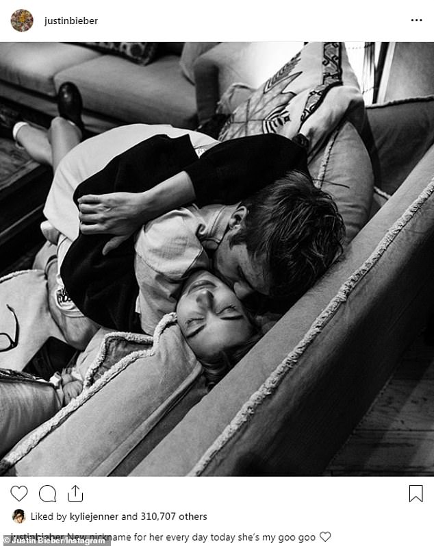 In his first, the Canadian singer cuddled up to his wife on a sofa as she rested her head on cushions with her eyes closed.