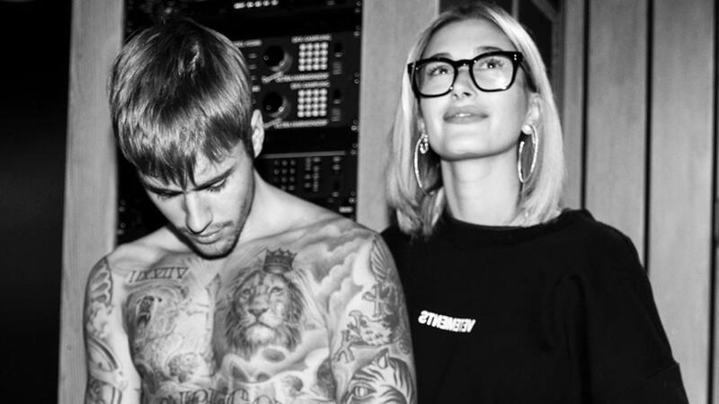 The Biebs showed off his tattooed upper body and Calvin Klein underwear in the second picture as he stood in front of his wife who sported a pair of black-framed spectacles.