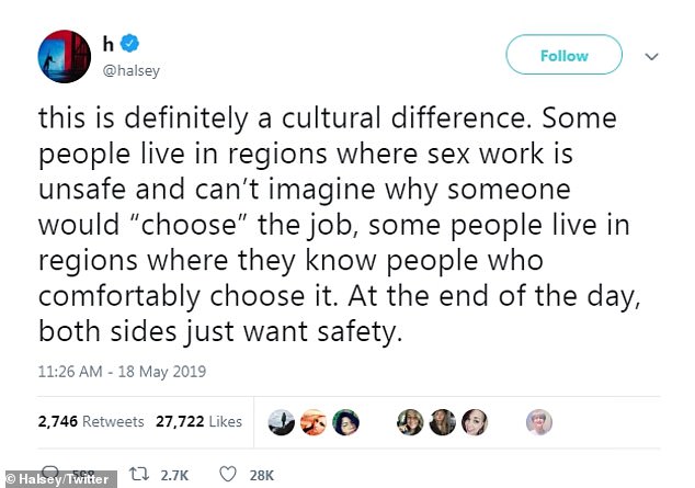'If you live in a place where sex work is widely considered unsafe, violent, or threatening, I can understand your rage at me supporting sex work,' she explained.