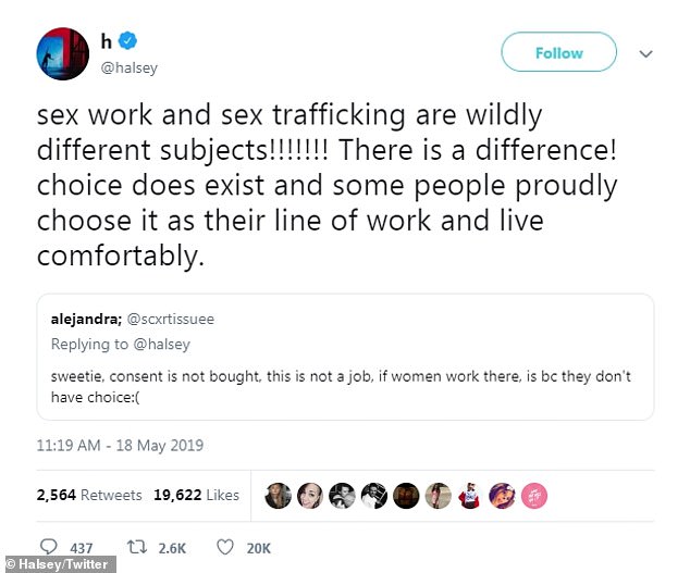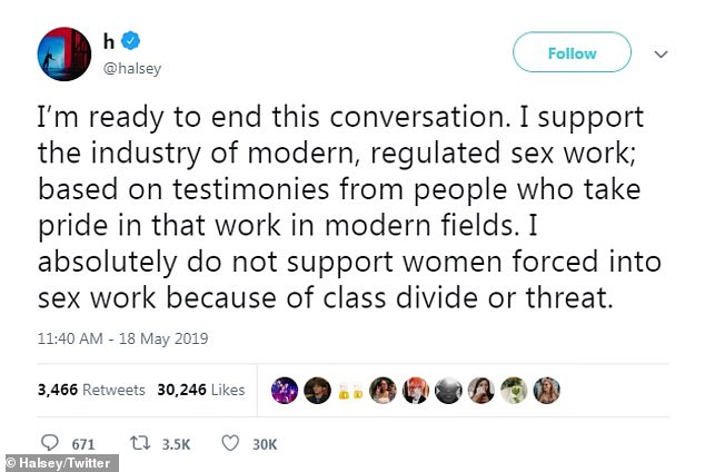 Halsey also clarified once more towards the end of her conversation that she was only supporting sex workers who chose to be a part of the industry not the ones who were forced into the field.