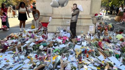 The memorial in Washington Square Park includes candles, notes and photographs.