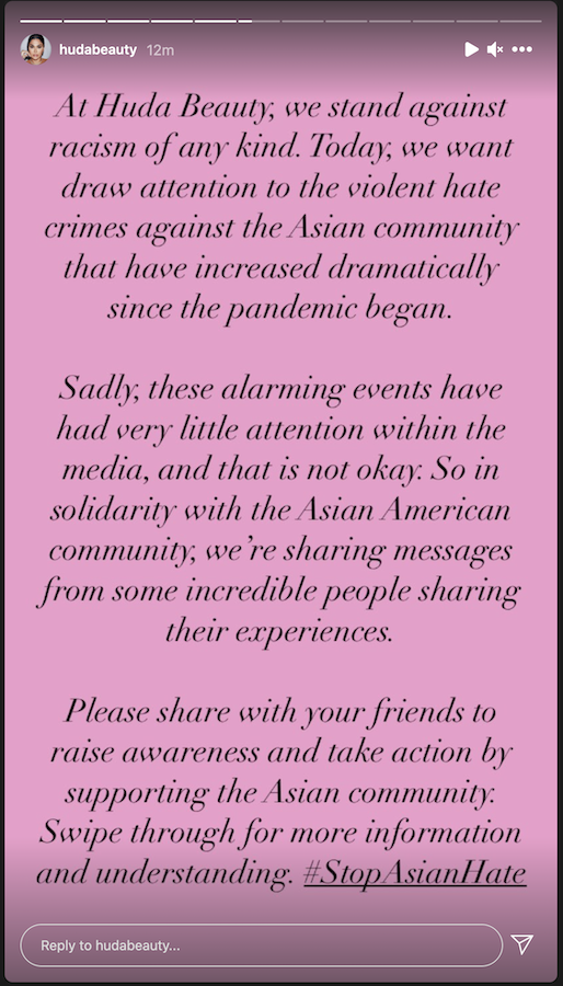 On her makeup brand Huda Beauty’s Instagram page, she shared a story writing: “At Huda Beauty, we stand against racism of any kind. Today, we want (to) draw attention to the violent hate crimes against the Asian community that have increased dramatically since the pandemic began.”