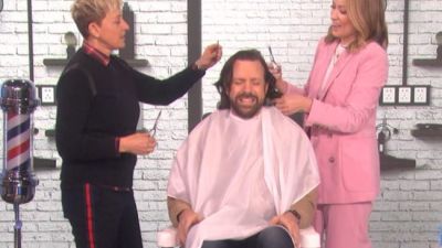 Wilde and DeGeneres transformed Sudeikis' shoulder-length hair into a shorter style above the ears. DeGeneres ended by carefully cutting the actor long bangs.