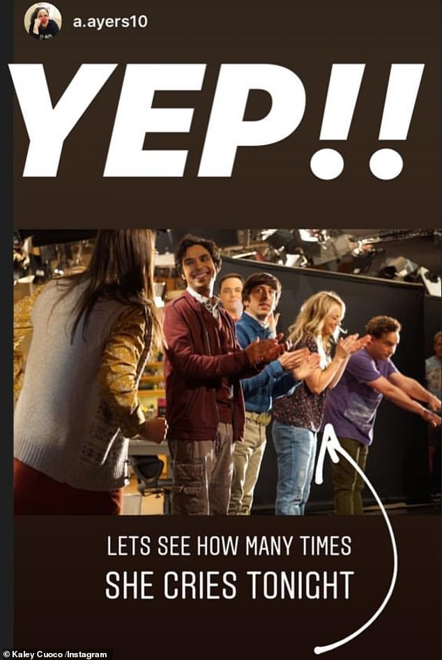 She reposted a photo from Alex Ayers, a Big Bang Theory writer, showing the cast at a taping where everyone seemed to be happy except for a crying Kaley.