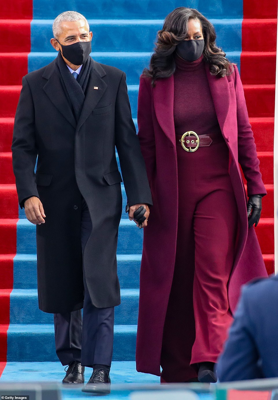 Mrs. Obama, who was joined by her husband, former President Barack Obama, cut a stylish figure in a head-to-toe plum suit by Sergio Hudson. The 57-year-old wore a floor-length coat over a form-fitting turtleneck and wide-leg pants — all in the same deep shade.