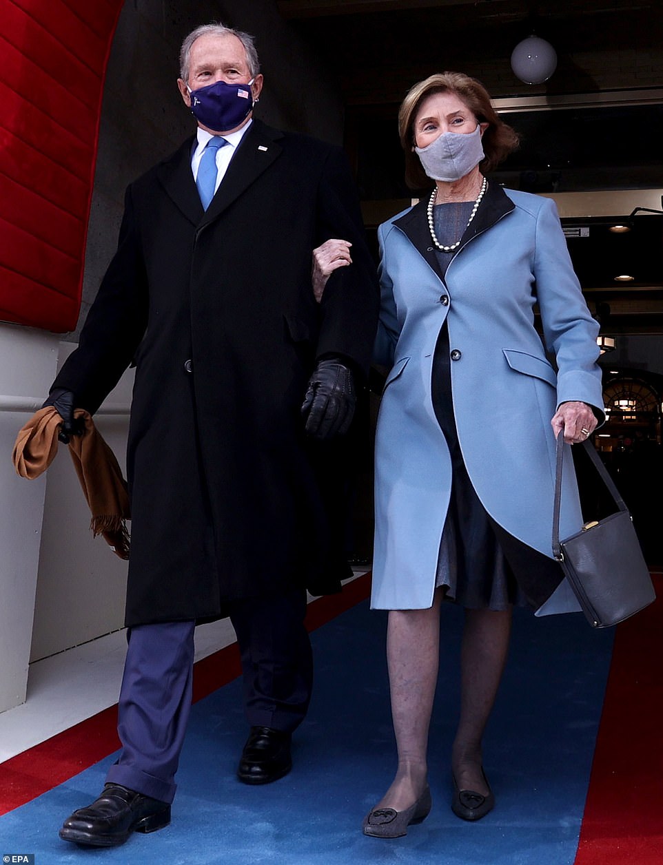 The top button of her coat was buttoned, and she carried a small gray leather handbag that perfectly matched her dress as she walked arm-in-arm with her husband, former President George W. Bush.