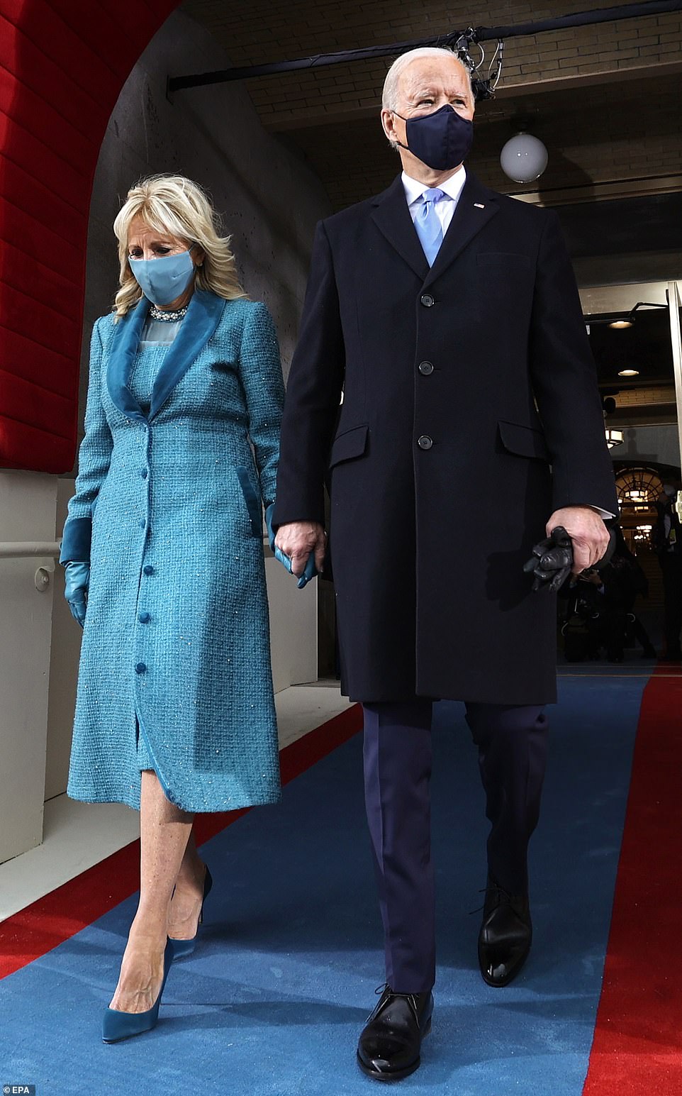 House Speaker Nancy Pelosi, 80, also stood out in a shade of blue. She donned a bright teal coat, which she wore over a white dress. Her scarf, heels, and patterned mask matched her coat, and she also sported leather gloves.