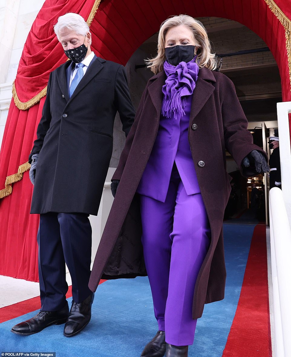 Purple appeared to be the color of the day as Mrs. Clinton, 73, donned a bright purple suit and matching scarf. To keep warm, the former secretary of state also wore a dark wool coat over her suit.