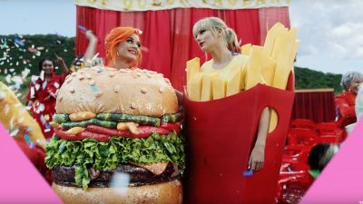 Taylor, 29, unveiled the promo on Monday (06.17.19) and in it Katy, 34, appears dressed as a giant burger in a food fight scene towards the end of the video and she spots Taylor in a french fries outfit and the pair come together for a cuddle.
