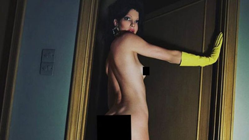 In a newly unveiled spread for Vogue Italia, the brunette beauty is seen completely naked — save for yellow rubber gloves, nude stockings and towering white heels — as she strikes a sultry pose with her back to the camera.