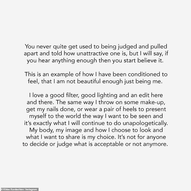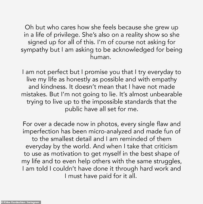 'In truth, the pressure, constant ridicule and judgment my entire life to be perfect and to meet other's standards of how I should look has been too much to bear. "Khloe is the fat sister." "Khloe is the ugly sister." "Her dad must not be her real dad because she looks so different." "The only way she could have lost that weight must have been from surgery." Should I go on?