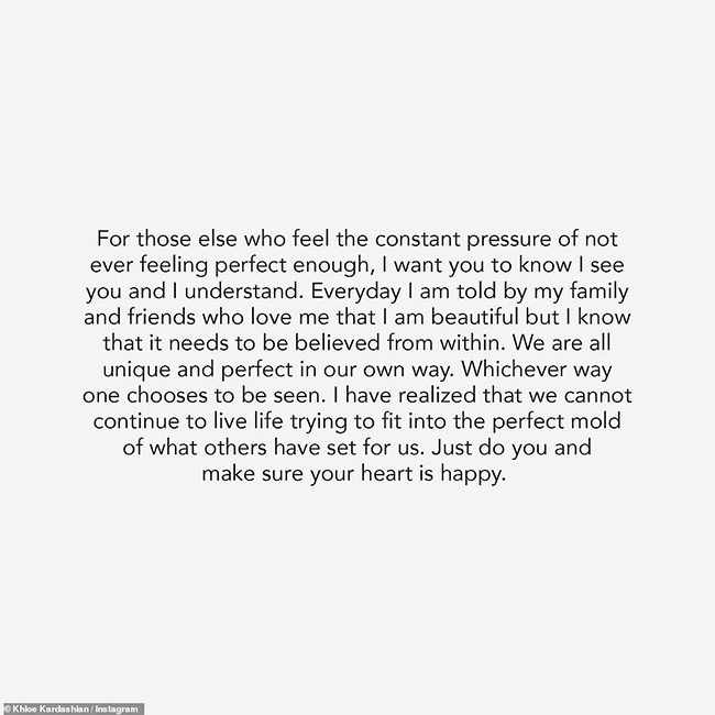 The reality star also posted a statement about her struggles with her body image, where she described feeling 'unbearable' 'pressure' to be 'perfect.'