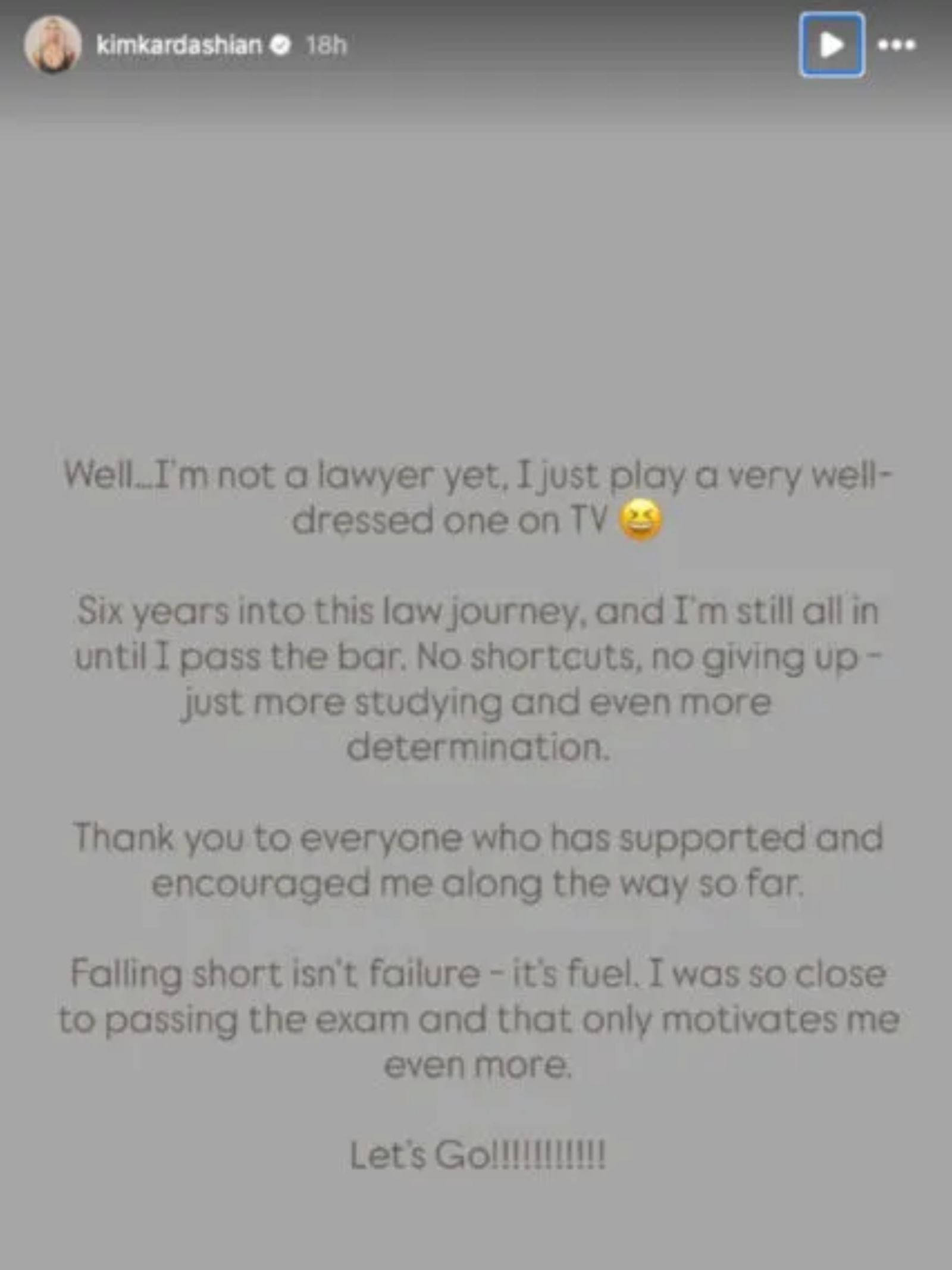 She also said, "Thank you to everyone who has helped and encouraged me so far." Not meeting your goals is not failing; it's fuel. I was so close to passing the test, which makes me want to do even better. "Let's go!"