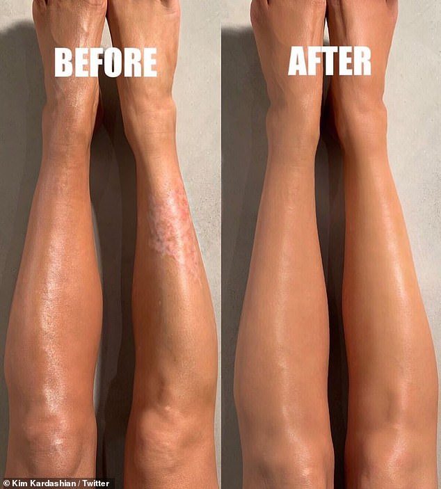 Another image shows her legs without any markings and covered with her latest product from the vast KKW Beauty empire.
