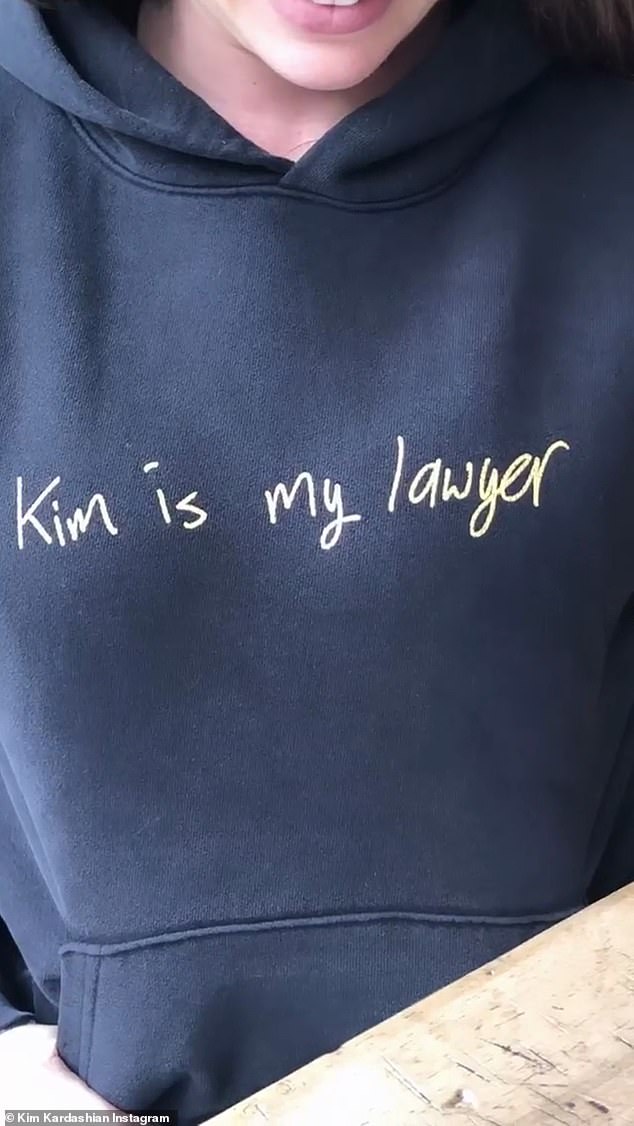 The 38-year-old aspiring lawyer also shared a video of one of her attorneys wearing a a custom-made sweatshirt emblazoned with the words 'Kim is my lawyer'.