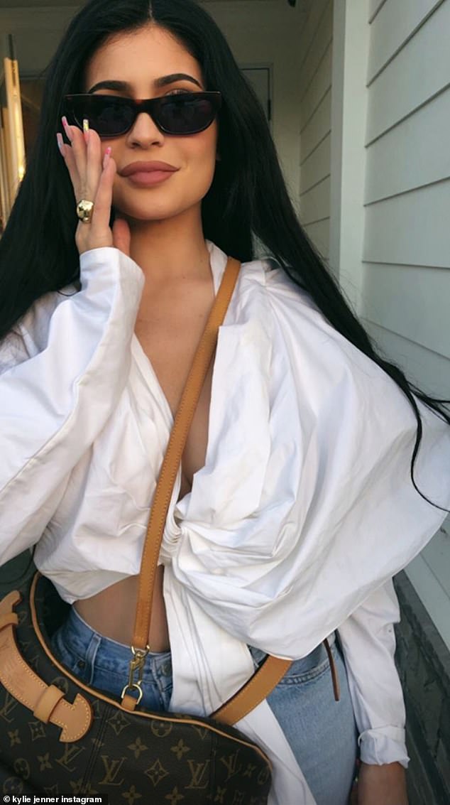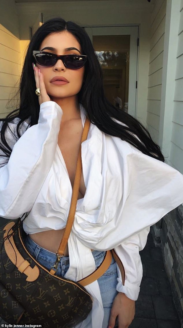 The 21-year-old makeup mogul had on a white blouse that showed a hint of her tummy as well as a pair of high-waisted jeans.