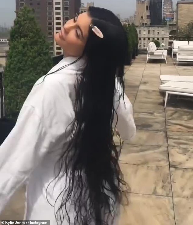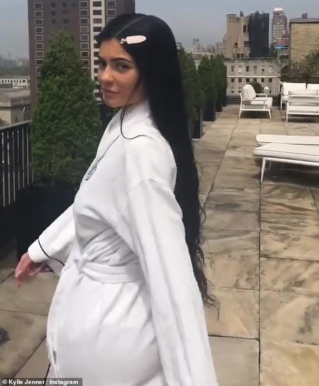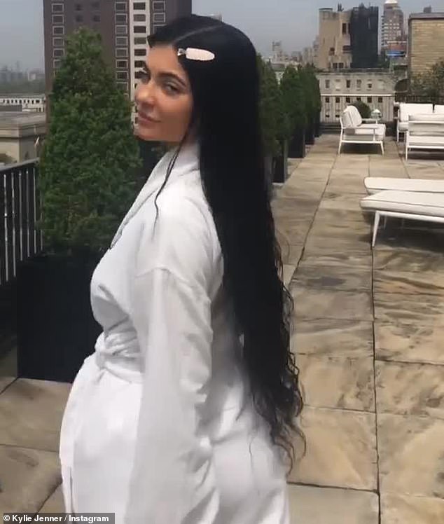 The 21-year-old lip kit icon could be seen flipping her drenched hair as she strolled across a New York City terrace while wearing a bathrobe.