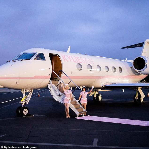 And on Saturday, Kylie Jenner  promoted her latest project in a huge way - taking to the skies in a pink and white private jet bearing the name of her new collection.