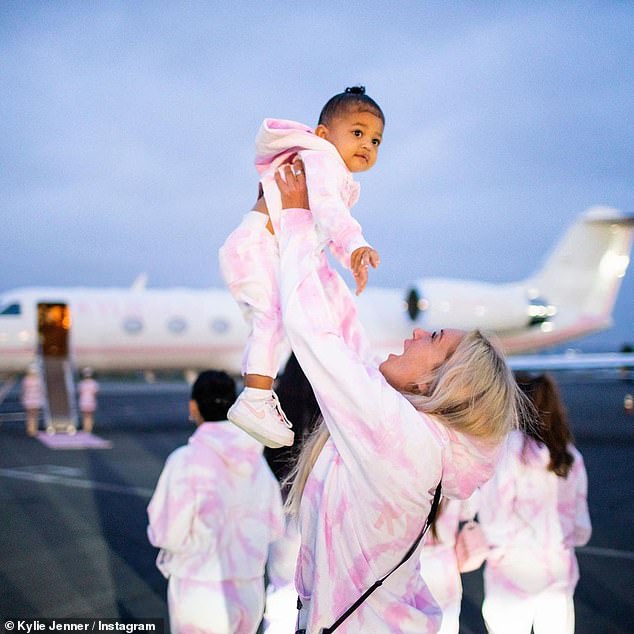 Joy: Jenner held up her daughter Stormi before she boarded the plane with a smile