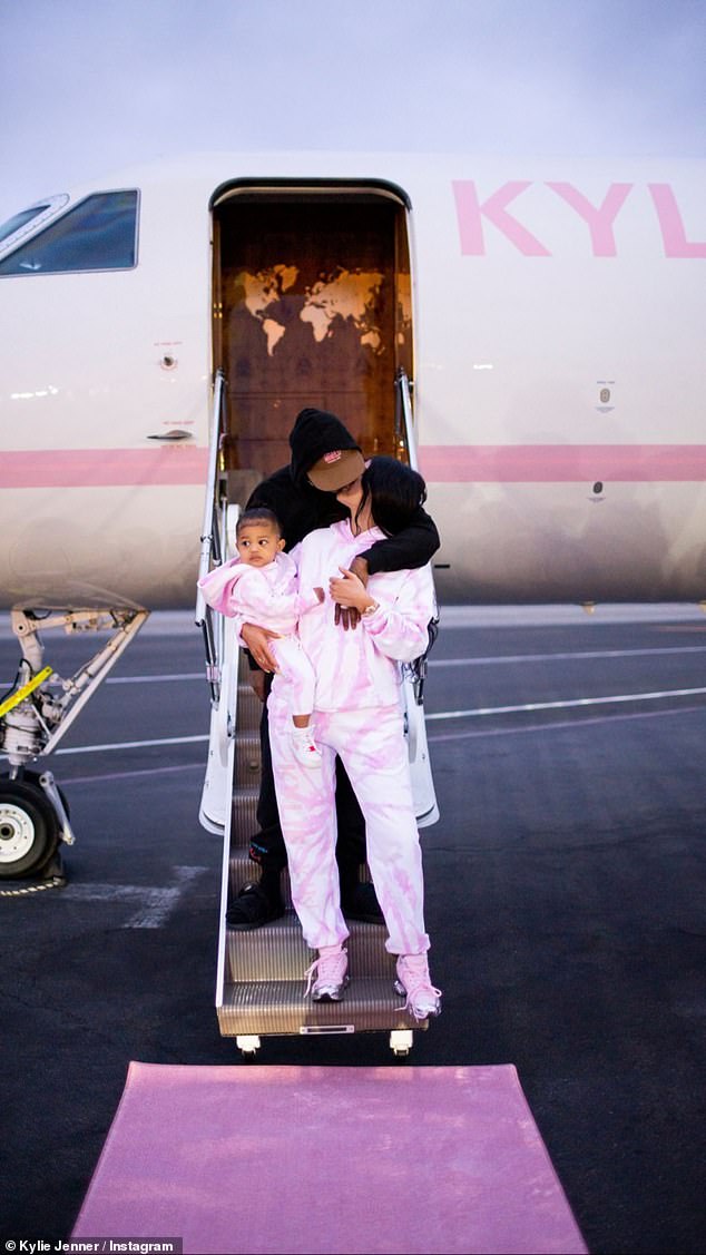 All aboard! Jenner, 21, invited her friends as well as one-year-old daughter Stormi to the jet's unveiling, rolling out a rose-colored carpet for them to walk on as they boarded the plane