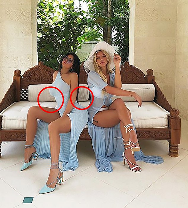 Some fans' eyes averted to a stripe on the couch that they claimed appeared to be curved unlike the rest of them, suggesting that that Kylie might have used a photo-editing tool to emphasize her assets.