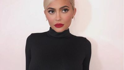 Kylie stunned in a black skivvy top and a matching colored form-fitting tights.