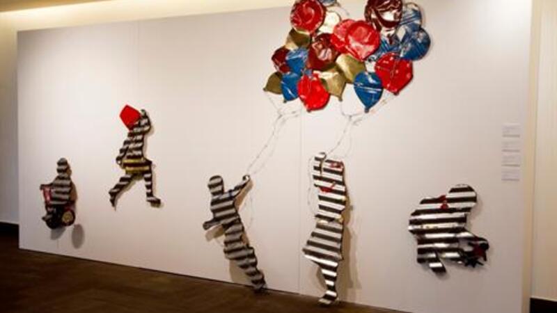 This collection of life-sized paper dolls-in-metal occupies an expanse of white wall to create a playground montage that, from a distance, is deceptively universal and cheerful. A little boy rides a tricycle as a girl plays with a red pail. A boy and girl clutching bunches of brightly colored balloons chase each other, while a solitary figure dissects a doll with a pair of scissors. None of the pieces have facial features so, at first glance, it could be a representation of any playground, anywhere in the world.