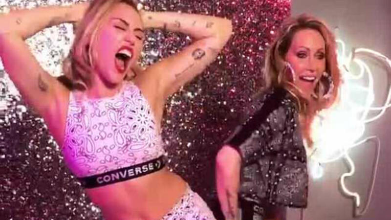The Wrecking Ball songstress, 25, glittered in a bedazzled Converse crop top and matching trousers while twerking as her mom, 51, playfully spanked her backside.