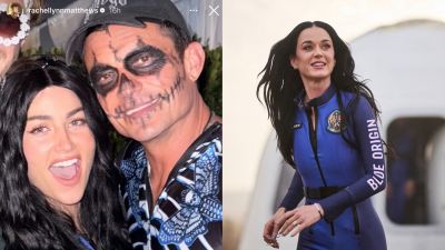 Bloom, dressed as a skeleton, was seen putting his arm around the Happy Death Day actress' shoulders in pictures posted on Matthews' Instagram Stories. She was wearing a blue bodysuit and a black wig, which reminded people of what Perry wore on her 11-minute Blue Origin mission to go to the edge of space.