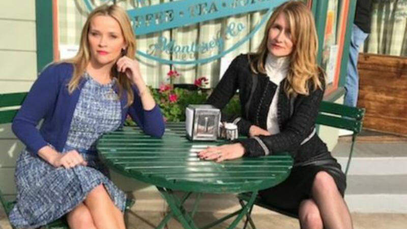 The picture shows Witherspoon and Dern sitting outside Seaside Coffee Shop in Monterey, Calif. Witherspoon wears a blue dress with a cardigan, while Dern sports a white turtleneck with a black skirt and cropped jacket.