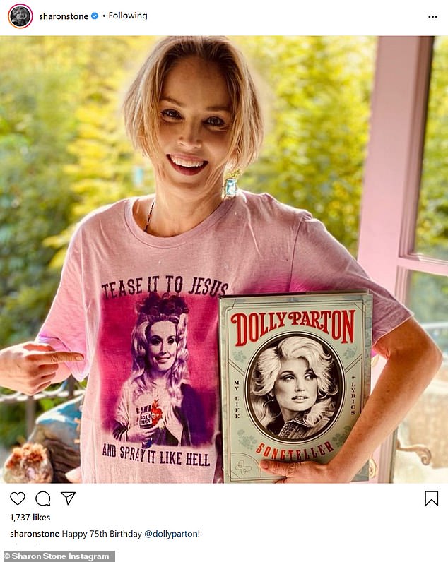 Sharon Stone proved she was a super-fan as she posted a photo of herself rocking heaps of Dolly swag and wished the Islands In The Stream singer a happy day.