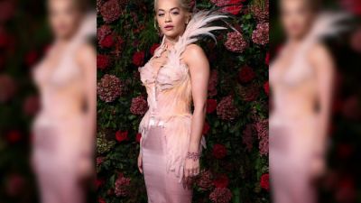 Rita ensured she took centre stage in her bodycon dress, featuring a dramatic feathered collar, with matching detailing running down the bodice and her hips.