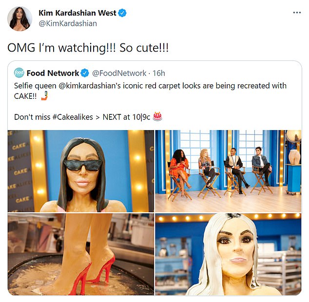 Kim was tickled to learn about the chic cakes, retweeting the network's teaser for Tuesday night writing: 'OMG I’m watching!!! So cute!!!'