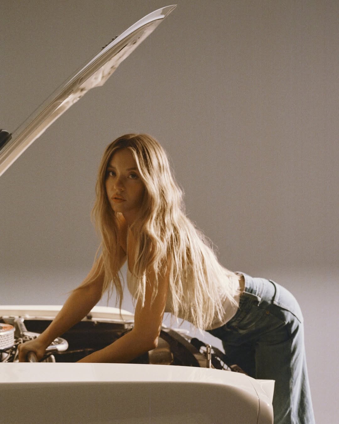 American Eagle's social media pages have campaign videos that show Sweeney working on a car while wearing different types of jeans. She also tests for a new part in the campaign and talks to the camera directly about the new collection.