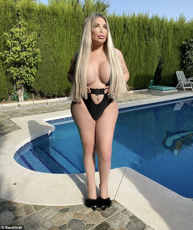The transgender TV star, 36, left very little to the imagination as she posed up a storm in a black plunging swimsuit while standing next to a pool in Marbella.