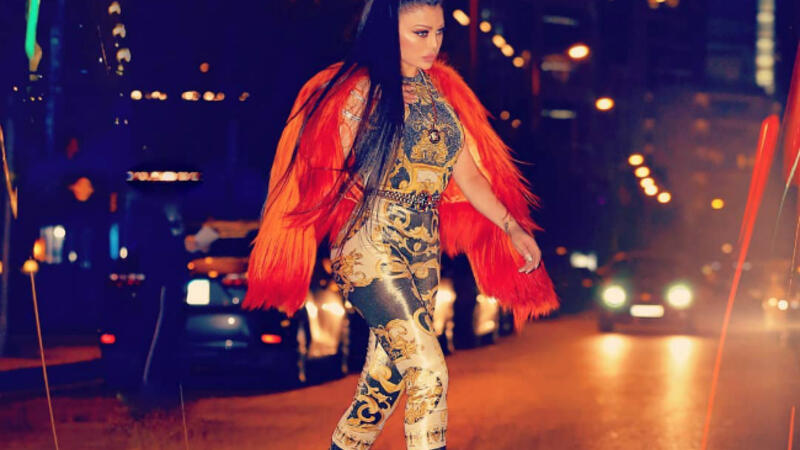 The lebanese beauty finished her look with an orange fur jacket.
