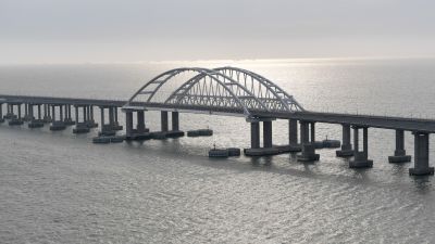 The Russian-controlled Crimean bridge consists of a separate roadway and railway supported by concrete stilts, giving way to a larger span supported by steel arches at the point where ships pass between the Black Sea and the smaller Azov Sea.