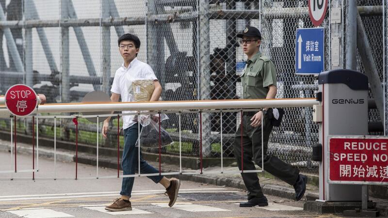 Hong Kong democracy activist Joshua Wong (L) leaves Lai Chi Kok Correctional Institute in Hong Kong on June 17, 2019. Wong called on the city's pro-Beijing leader Carrie Lam to resign after he walked free from prison, as historic anti-government protests rocked the city. (ISAAC LAWRENCE / AFP)